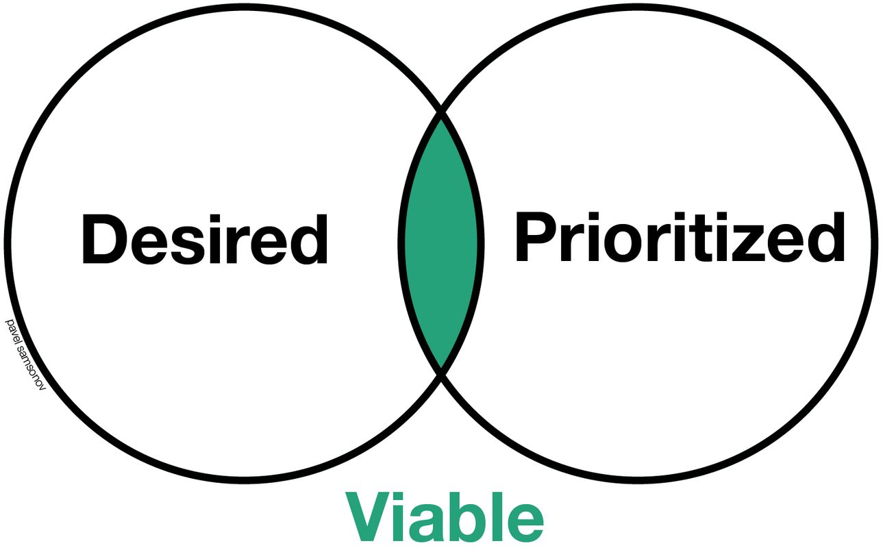 Viability is a secondary factor, one that is determined by two things: how important a thing the customer perceives the thing to be, and how important the business perceives the thing to be. The first factor is of course, desirability. The second factor is its business-facing mirror Priority. The viability of a particular product is going to be constrained by these two factors; it doesn’t matter how valuable it is if that value doesn’t have a place in the business’s framing of its strategy.