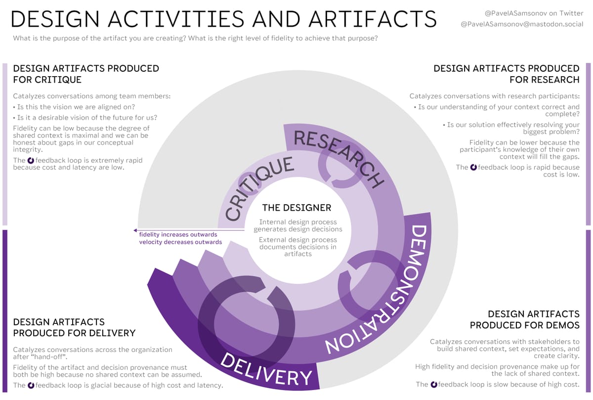 Scott Berkun puts this sentiment very well: “You must be a master of idea diffusion, not just idea creation.” The visual design artifact is one of the tools we can use for that, but it’s not the end goal. The end goal is to change minds within the organization.